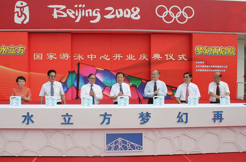北京市副市長程紅在慶典中致辭。北京市委常委、統(tǒng)戰(zhàn)部部長牛有成宣布“國家游泳中心完成賽后改造,現(xiàn)重新對外開放”。隨后,中央及北京市有關領導、捐資人代表共同為水立方開啟“全新水立方 夢幻再啟航”的大門,水立方以嶄新的形象展現(xiàn)在社會公眾面前。參加慶典的領導隨后參觀了水立方場館,并出席了在水立方內(nèi)舉辦的“港澳臺同胞海外華僑華人支持北京2008奧運會紀念展揭幕儀式”。
