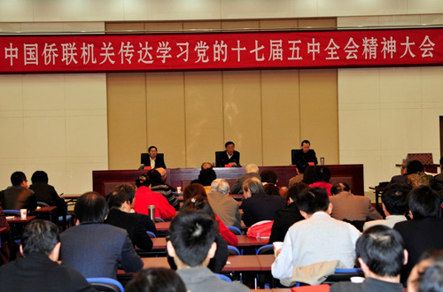 中新網10月20日電 據中國僑聯網消息,10月19日上午,中國僑聯機關召開傳達學習黨的十七屆五中全會精神大會。中國僑聯在京顧問、僑聯機關、直屬企事業單位、離退休全體黨員參加了會議。中國僑聯主席林軍介紹了參加十七屆五中全會的情況并傳達了中共中央總書記胡錦濤在全會上的兩次講話和國務院總理溫家寶就《中共中央關于制定國民經濟和社會發展第十二個五年規劃的建議》所作的說明。中國僑聯副主席董中原主持會議,副主席喬衛出席會議。