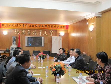 在法國期間,訪問團拜訪了法國華僑華人會,F任主席陳勝武及副主席張過祥、陳其躍等負責人,熱情接待了訪問團,相互進行了座談;訪問團還參觀了位于巴黎市中心四區的會所、文化中心,及中華文化學校。通過座談參觀,訪問團了解到,近年來,隨著中國國力迅速增長,旅法華人地位不斷提高,華人也在改變過去不關心政治的慣例,正在努力融入當地主流社會。訪問團與法國華僑華人會互贈了禮品;法國歐華歷史學會會長葉星球還向訪問團贈送了其撰寫的《法國華人三百年》一書。