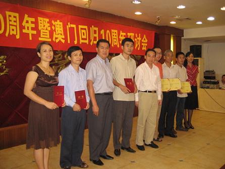 10月14日下午,廣東省江門(mén)市僑聯(lián)、江門(mén)市華僑歷史學(xué)會(huì)在市僑聯(lián)大廈舉行以“慶祝建國(guó)60周年暨澳門(mén)回歸10周年”為主題的研討會(huì)。江門(mén)市政府副市長(zhǎng)謝日榮,市外事僑務(wù)局局長(zhǎng)、僑聯(lián)主席張國(guó)富,市社科聯(lián)主席楊偉雄,澳門(mén)大學(xué)中國(guó)文化研究中心主任鄭德華教授等專(zhuān)家學(xué)者以及學(xué)會(huì)理事等50多人出席。研討會(huì)由江門(mén)市僑聯(lián)專(zhuān)職副主席林春暉主持。