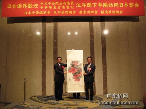 日本中華總商會會長嚴浩代表宴會主辦單位向廣東省代表團贈送了紀念品,廣東省委常委、廣州市委書記朱小丹向宴會主辦單位回贈了國畫《紅荔》。廣東省外辦、省外經貿廳等省直有關單位及有關市領導也出席了當晚的歡迎晚宴。(陳雪婷)