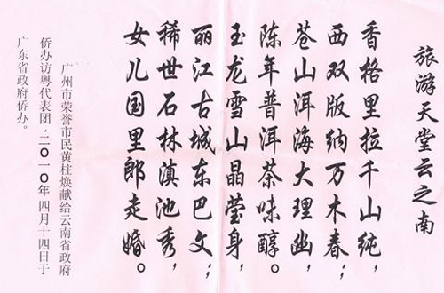 中新網(wǎng)4月16日電 據(jù)云南省僑辦網(wǎng)站消息,4月14日,云南省僑辦副主任張新明一行到廣州舉辦第八屆東盟華商會(huì)項(xiàng)目推介,受到廣東省僑辦及廣東省僑商會(huì)熱烈歡迎。廣州市榮譽(yù)市名、廣東省僑商會(huì)常務(wù)理事黃柱煥先生特賦詩一首。