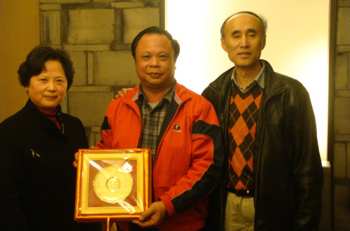 圖為四川省僑聯副主席、成都市僑聯名譽主席聶劍(左)成都市僑聯黨組書記譚小林(右)向玉林市僑聯主席鐘雄(中)贈送紀念品