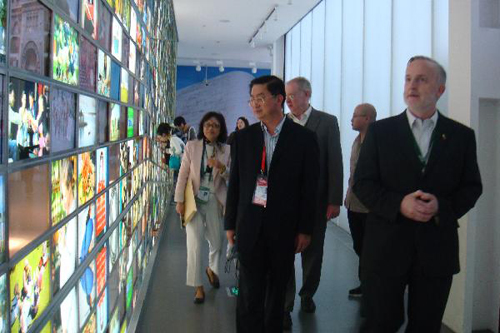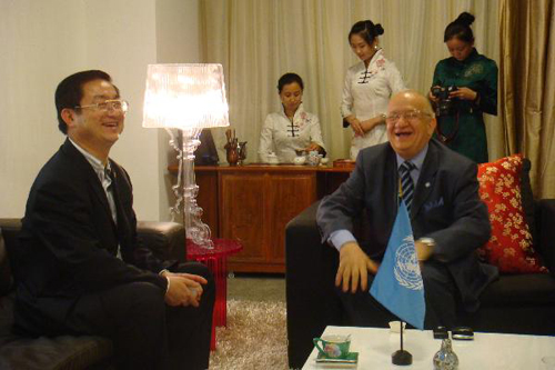 在聯合國館項目服務商、美國全美蘇浙同鄉總會會長朱元忠的陪同下,崔明華一行又參觀了上海世博會聯合國館,并體驗了在聯合國館內舉行的中國茶藝表演,并于聯合國副秘書長阿瓦尼·貝南進行了親切的會談。崔明華最后也在留言薄上題詞:“和諧之理念,發展之動力!