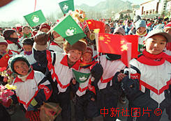 西藏拉薩市的藏族兒童在澳門回歸祖國之際,連日來冒著嚴(yán)寒在街上與成人一起游行。