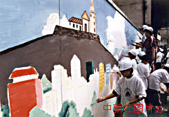圖片說(shuō)明: 澳門兒童在街頭工地圍板上繪出城市風(fēng)光,以美化環(huán)境。