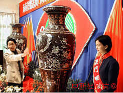 海南省祝賀澳門回歸的禮品—— “椰樹傳說”和“天涯歡歌”巨型椰雕嵌貝花瓶二月一日下午在海口市正式亮相,不日將運往珠海然后送抵澳門。兩座花瓶各重八十公斤,高一千九百九十九毫米。這對花瓶由海南省藝術家設計,海口市椰雕廠的三十名工匠共同制作完成的。