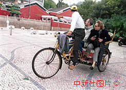 許多外國游客回歸前親臨澳門,乘坐獨特的人力三輪車觀賞葡萄牙當年登上澳門的媽閣廟。中新社傳真