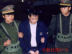 廣東省佛山市公安局經過一年的偵查,搗毀了一個粵澳黑社會組織相互勾結開賭放數、追債勒索的犯罪團伙,抓獲涉案人員二十八名,繳獲槍支彈藥一批。圖為犯罪團伙頭目曾啟強(中)被警方抓獲。