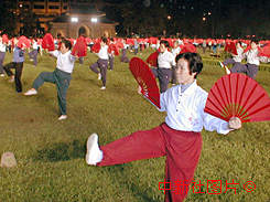 廣州市慶澳門回歸中心會場文藝晚會十一日晚抓緊演練,市太極拳研究會的五百名會員在中山紀念堂排練太極雙扇舞。