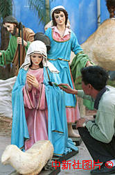 澳門市工人在街頭裝飾圣經(jīng)故事人物塑像,迎接圣誕節(jié)的到來。 中新社傳真 毛建軍攝