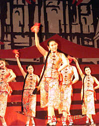 喜迎澳門回歸歌舞音樂會十四日在北京人民大會堂舉行。圖為陳愛蓮藝術團的演員在表演舞蹈《大姑娘美》。