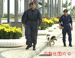 澳門特警隊(duì)員帶領(lǐng)警犬在政權(quán)交接場地四周巡羅檢查。