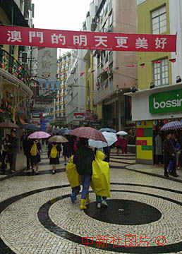 澳門板樟堂街鬧市懸掛醒目標語,表達出市民對回歸后的信心。中新社數碼傳真 賈國榮攝