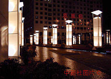 澳門政權交接場地外的迎賓路兩邊豎立透明燈柱,富于現代藝術氣息。 中新社數碼傳真 賈國榮攝
