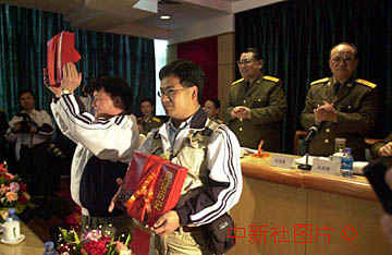 澳門日報記者(右一)代表解放軍進駐澳門部隊隨軍記者團,18日在珠海接受廣州軍區司令員陶伯鈞,政委劉書田頒發的紀念冊。中新社數碼傳真 王瑤攝