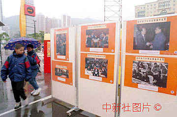 香港島各界聯合會十八日冒雨在維多利亞公園舉辦"慶祝澳門回歸祖國圖片展覽",展覽展示了中華民族從此洗脫屈辱的歷程和回歸前的澳門風貌。中新社傳真楊佐桓攝