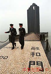 澳門警察在海濱紀念建筑融和門前執勤。中新社傳真 彭振戈攝