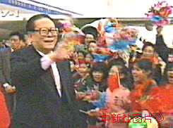 國家主席江澤民十九日正午十二時十八分踏上了澳門的土地。江澤民站在紅地毯上向澳門招手。中新社傳真