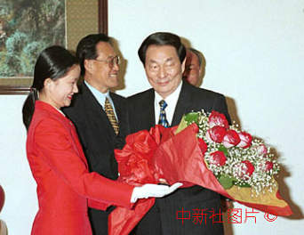 朱镕基總理十九日抵達(dá)澳門(mén)新竹苑賓館,禮儀小姐立即獻(xiàn)上一束鮮花。