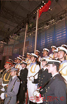 參加澳門政權交接儀式的中國人民解放軍與葡萄牙軍隊的儀仗隊官兵們,共同在中國五星紅旗下合影留念。中新社傳真 毛建軍攝
