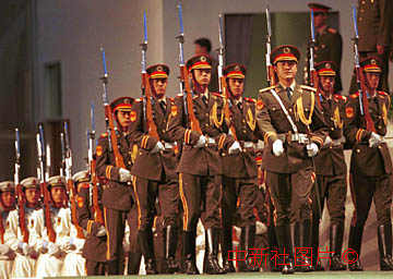 中國人民解放軍三軍儀仗隊進入澳門政權交接大廳,執行盛典禮儀。中新社傳真 毛建軍攝