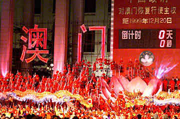 一九九九年十二月二十日零點零分,北京天安門廣場澳門回歸倒計時牌前一片歡騰。(本社記者天安門廣場零點現場數碼傳真)作者:滿會喬