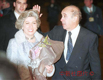 澳督韋奇立和夫人二十日凌晨參加完政權(quán)交接儀式后,登機(jī)飛離澳門(mén)前回首揮手告別。中新社傳真 賈國(guó)榮攝