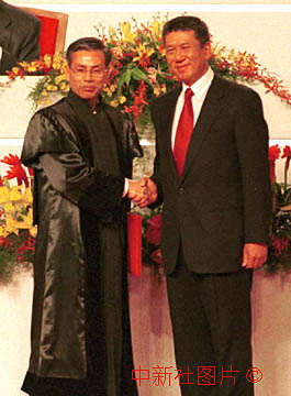 澳門特區檢察院檢察長向澳門特別行政區首任行政長官何厚鏵宣誓就職。中新社傳真 洪少葵攝