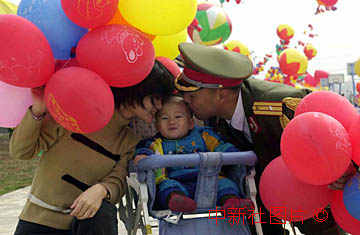 駐澳部隊通訊兵黃立新和前來送行的妻子,一歲的兒子告別。中新社數碼傳真 王瑤攝