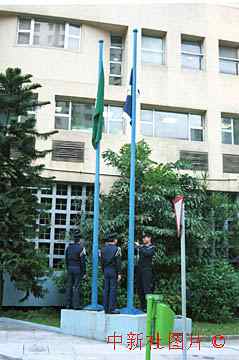 澳門治安警察局舉行升旗儀式。擁有四千多名警察的治安警察局是當日零點將原治安警察廳中的“廳”換掉而改為本名的。 中新社傳真 曾憲成攝
