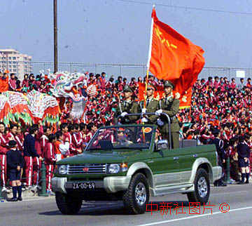 澳門居民二十日上午夾道歡迎乘軍車入城的解放軍。