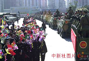 解放軍駐澳門部隊二十日十二點整前進到珠海與澳門相連的關閘,開始進駐澳門,受到珠海軍民的熱烈歡送。中新社數碼傳真 王瑤攝